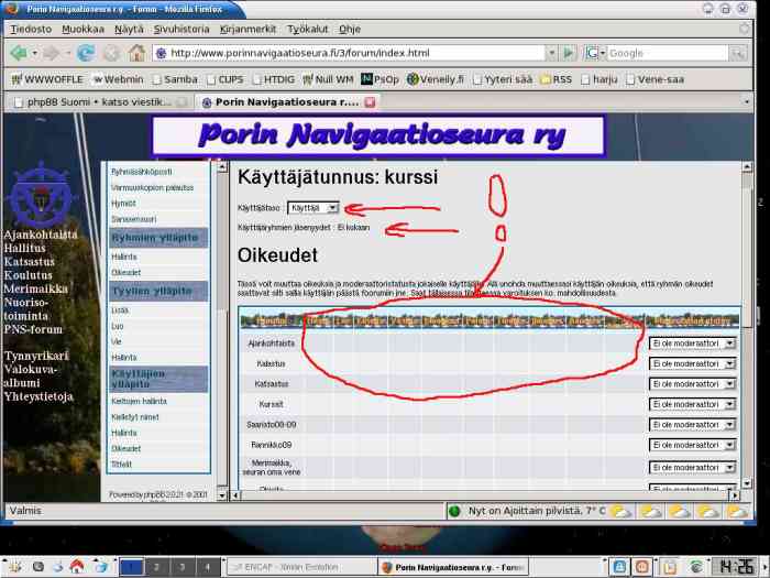 Foorumin osoite: http://www.porinnavigaatioesura.fi/forum Käytössä oleva tyyli: SubSilver Mitä MODeja on asennettuna: - phpBB:n versio: 2.0.21 PHP versio: 4.4.7 Mikä tietokanta ja sen versio: mysql Ver 14.7 Distrib 4.1.22 Palveluntarjoaja: shnetworks Onko tämä asennettu itse?: on Onko tämä päivitys,...