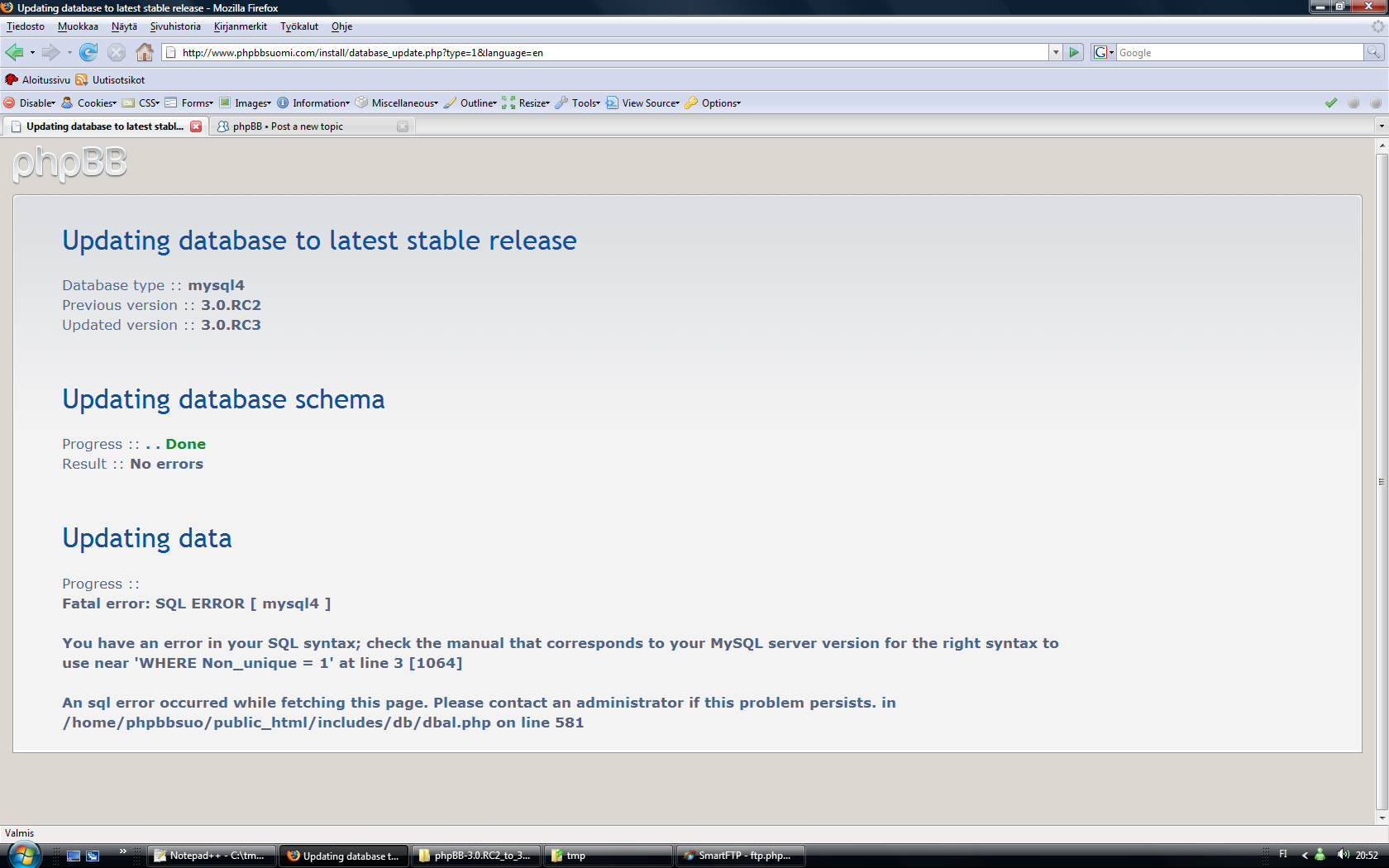 MySQL:n versiolla 5.0.22-Debian_0ubuntu6.06.3-log ei ongelmia.Lurttinen kirjoitti:Mitään ongelmia tietokantojen kanssa?