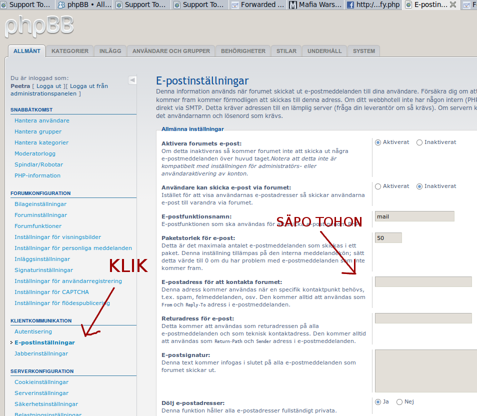 Löysin paikan mutta siellä ei ole kohtaa mihin voisi uuden sähköpostin laittaa. Olettaen siis että tää paikka on siellä Ylläpidon asetuksissa...