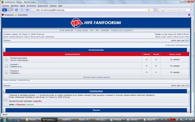 Jees, kyl nyt luovutan, en saamari saa sitä boxin alaosan väriä muuttumaan vaikka mitä tekisin, tuntuu jotenkin käsittämättömältä, ettei mitään tapahdu värien suhteen, vaikka joka kohtaan pistäis FFFFFF, jotenka ratkaisin ongelman ja latasin eTech tyylin phpbb.com ja siinä teemassa voi värit muutella kuvatiedostoilla ja foorumin saa halutunlaiseksi, demoks tein HIFK fanifoorumin ja kuva värityksistä, Ps älkää tykätkö kyttyrää joukkuevalinnasta, teemoja pystyy muuttamaan ja minkä tahansa joukkueen foorumin voi valmistaa...sM-liigajengeillä nyt taitaa olla foorumit kaikilla, mutta testiä testiä..