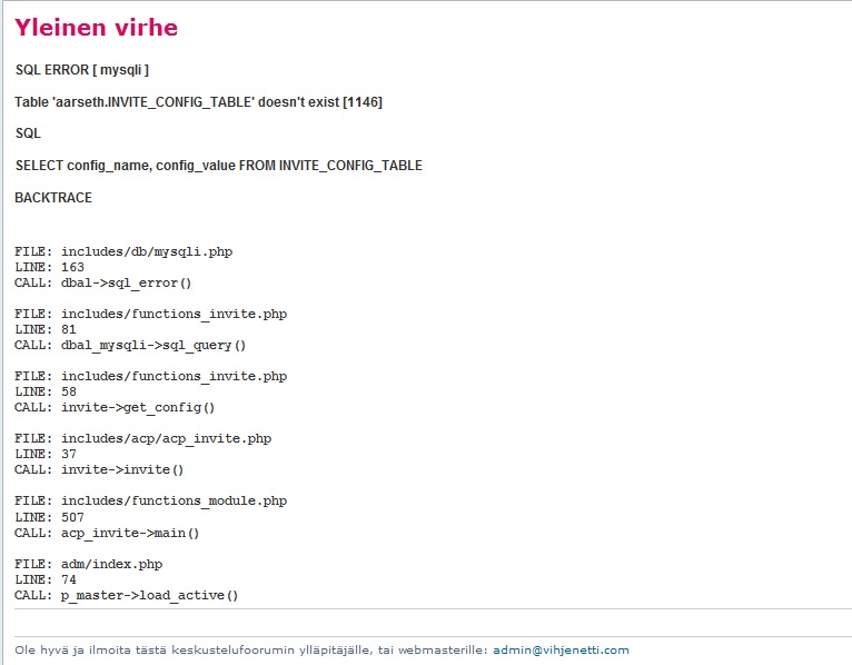 Asensin joskus tuon Invite modin ja sitten poistin sen, ja sen jälkeen alkoi herjaamaan tuollaista. Eli kyseessä ei ole modin asennusvaihe vaan poisto...mikäli nyt oikein ymmärsin tekstisi. :?