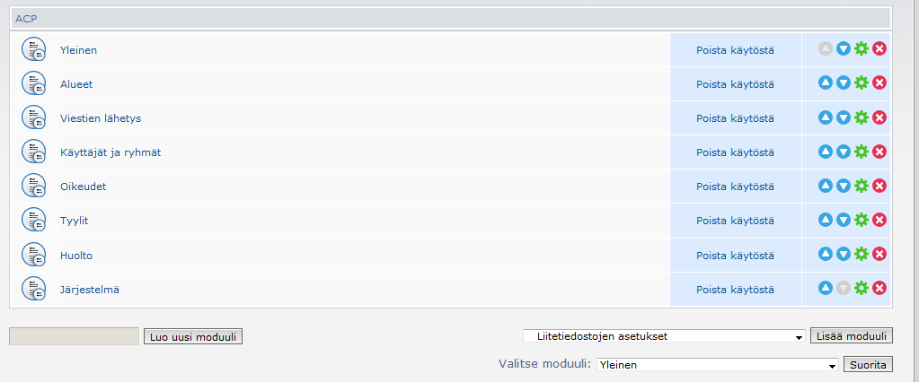 Tulikin tuosta mieleen, että kokeilin sitä saada näkyviin poistamalla moduulin (oletin, että sen saa takaisin), mutta sitä ei saanut. Siis poistin sen moduulien hallinnasta: Saako sitä mitenkään takaisin, jos se olikin siitä kiinni?Lurttinen kirjoitti:Se välilehti tulee näkyviin jos on asennettu MODeja, joita voi hämmentää ylläpidosta.