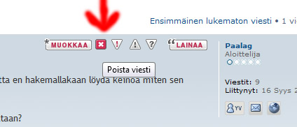 Jos ylläpitäjällä on oikeudet poistaa viestejä, niin tuostahan se nappula pitäs löytyä.