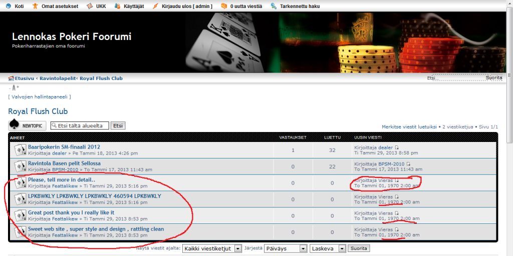 Tätä roskapostia on nyt tämän vuoden puolella vasta alkanut tulla, ja koko ajan tulee enemmän. Foorumi on ollut nyt neljä vuotta käytössä ja aiemmin roskapostia on tullut vain muutama vuodessa. Nyt tulee satoja kuukaudessa, ehkä jopa viikossa.